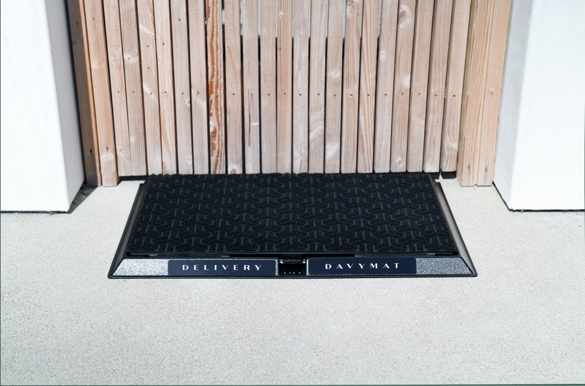 This contemporary doormat is the perfect fit atop the innovative Davymat Delivery Locker. This doormat includes hook and loop backing (aka Velcro) for easy install on your Davymat Delivery Locker.